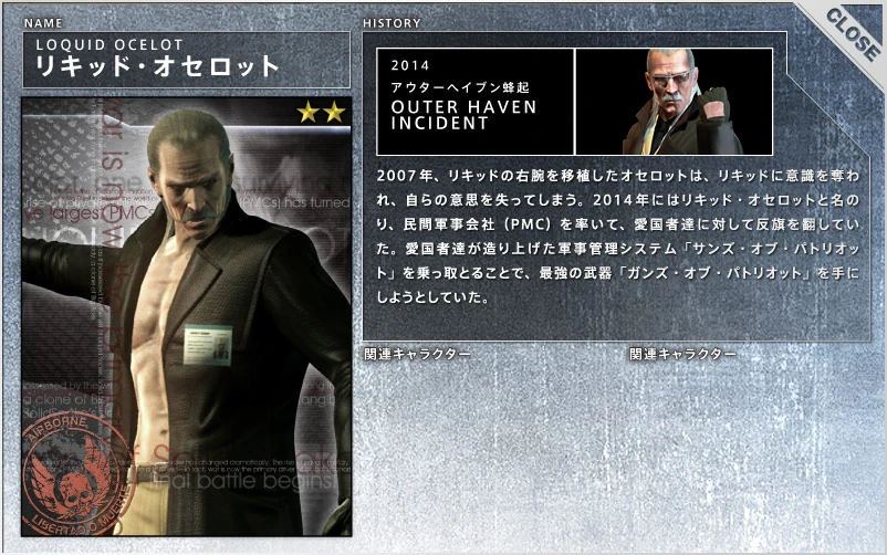 - ^ Metal Gear Solid 4 Database, Kojima Productions (2008). "Ocelot"