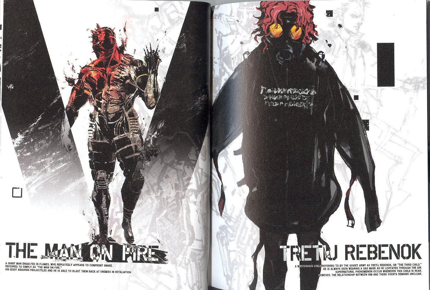 In February 1984, Mantis was transported to a Moscow research lab from Czechoslovakia via a plane. During this time, he wore a gas mask to help prevent the thoughts and emotions of others from entering his mind. The plane's flight path took it near a hospital containing the comatose Venom Snake and Big Boss, whose hateful subconscious influenced Mantis's uncontrollable power, causing the plane to explode and crash. Being the only survivor, Mantis was recovered and sent to the lab, which focused on researching paranormal abilities in individuals, and given the codename "Tretij Rebenok". It was there that the comatose body of Yevgeny Borisovitch Volgin was also being held. Mantis could sense the anger and resentment Volgin held for Big Boss, as the two were gradually awakening. Volgin's hatred influenced Mantis, causing his body to reanimate as the "Man on Fire." The two burned the entire facility down as their rampage began.